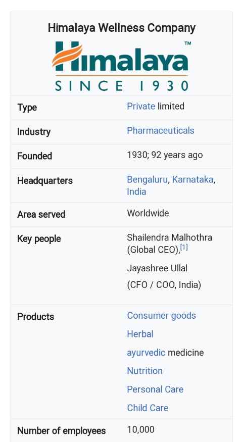 Himalaya Drug Company is an Indian multinationalpharmaceutical company established by Mohammed Manal in 1930 and based in Bengaluru, Karnataka, India. It produces health care products under the name Himalaya Herbal Healthcare whose products include ayurvedic ingredients. It is spread across locations in India, United States, Middle East, Asia, Europe and Oceania,[2] while its products are sold in 106 countries across the world.[3] The company has more than 290 researchers that utilise ayurvedic herbs and minerals.[4] A hepatic drug, named Liv.52, is its flagship product, first introduced in 1955.[3][5]